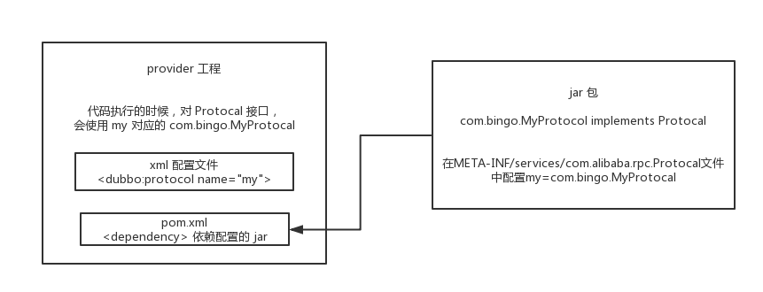 自己写个工程,要是那种可以打成 jar 包的,里面的 src/main/resources 目录下,搞一个 META-INF/services ,里面放个文件叫: com.alibaba.dubbo.rpc.Protocol ,文件里搞一个 my=com.bingo.MyProtocol 。自己把 jar 弄到 nexus 私服里去。